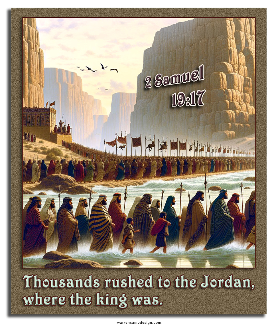 Verse 14 reveals that “He [David] won over the hearts of the men of Judah so that they were all of one mind. They sent word to the king, ‘Return, you and all your men.’” He wanted his reception to be unanimous. The men of Judah responded together to the wooing work of Zadok and Abiathar. In the end, we learn of the success of David’s strategies (v. 14). David crossed the Jordan River with help from Judah and Benjamin. Once he’d received an official invitation to return as king — if only from the tribe of Judah — he left his secure position at Mahanaim and traveled as far as the east bank of the Jordan River ford at Gilgal, which is where the pageantry began. Such pageantry was important to all to regain a sense of unity and national pride in their king (v. 15).