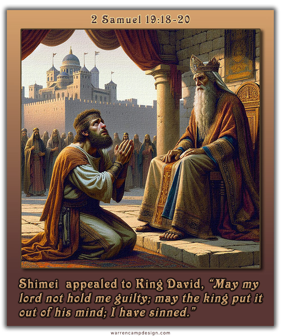 Shimei Repents Wholeheartedly Shimei was no stranger to us or to David. He was the descendant of Saul who harassed David and those with him when they fled from Jerusalem (16:5). He hurled rocks, dirt, accusations, and insults at David. Abishai then wanted to shut this man’s mouth permanently but David refused, assuming that God was, in some way, rebuking him through this loudmouth. Now, on his return, David had to pass through Bahurim, Shimei’s hometown. Shimei knew he was in serious trouble. David was once again Israel’s king; he reasonably viewed Shimei as a traitor who needed to be removed.