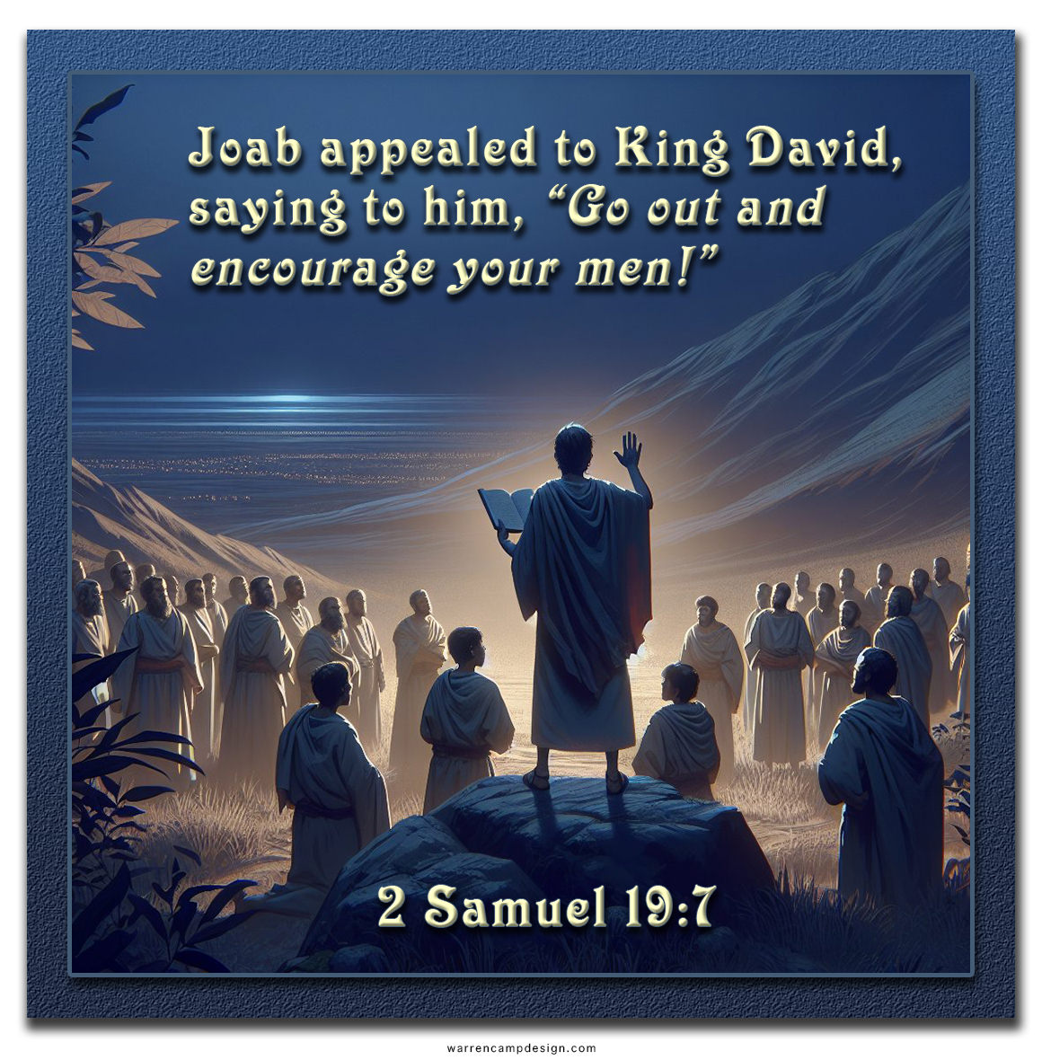 In these eight opening verses, David responds twice to the news of Absalom’s death. He does that similarly to the way he did when he learned of Saul’s death (ch. 1). The king had been weeping and mourning over Absalom’s death. Over and over he repeated, “O my son Absalom! O Absalom, my son, my son!” (v. 4). Joab wasn’t inclined to join David in his mourning. He deliberately went into David’s house, not to deal gently with David but forcefully, giving him an outright order: “Now go out and encourage your men” (v. 7a). In Joab’s mind, David was making the greatest mistake of his life; he was about to suffer consequences far greater than any he’d yet experienced. Certainly, he was correct to weep over Absalom’s death. His mourning had been heard all over the city and put a damper on what would normally would have been rejoicing over a great victory. However, Joab realized the danger and rushed to David with a stern rebuke — the kind of rebuke that only a loyal friend could give.