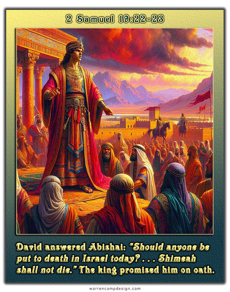 • David responds to Abishai’s suggestion to punish Shimei by insisting that no one will be put to death on this day of restoration, demonstrating mercy (v. 22).