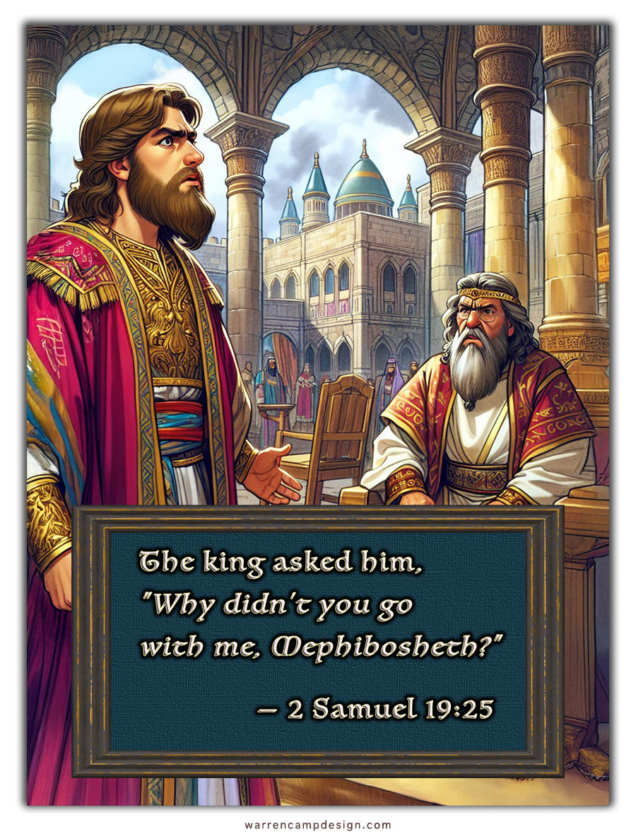 Here in chapter 19, King David was returning to Jerusalem and his throne. Ziba, his sons and servants, and Mephibosheth were there to greet and help him on his journey through the Jordan, on to Jerusalem. Although Ziba was in the area, the conversation here was between David and Mephibosheth, the one who appeared to have forsaken David while Mephibosheth seemingly was in good standing. So David asked him why he didn’t accompany him when he fled from Jerusalem. His excuse was a poor one. He didn’t admit wrongdoing; he sought to defend himself by telling David that he’d been deceived by Ziba (v. 26). Then Mephibosheth added that Ziba slandered the king, no doubt by telling the king that he was staying in Jerusalem.