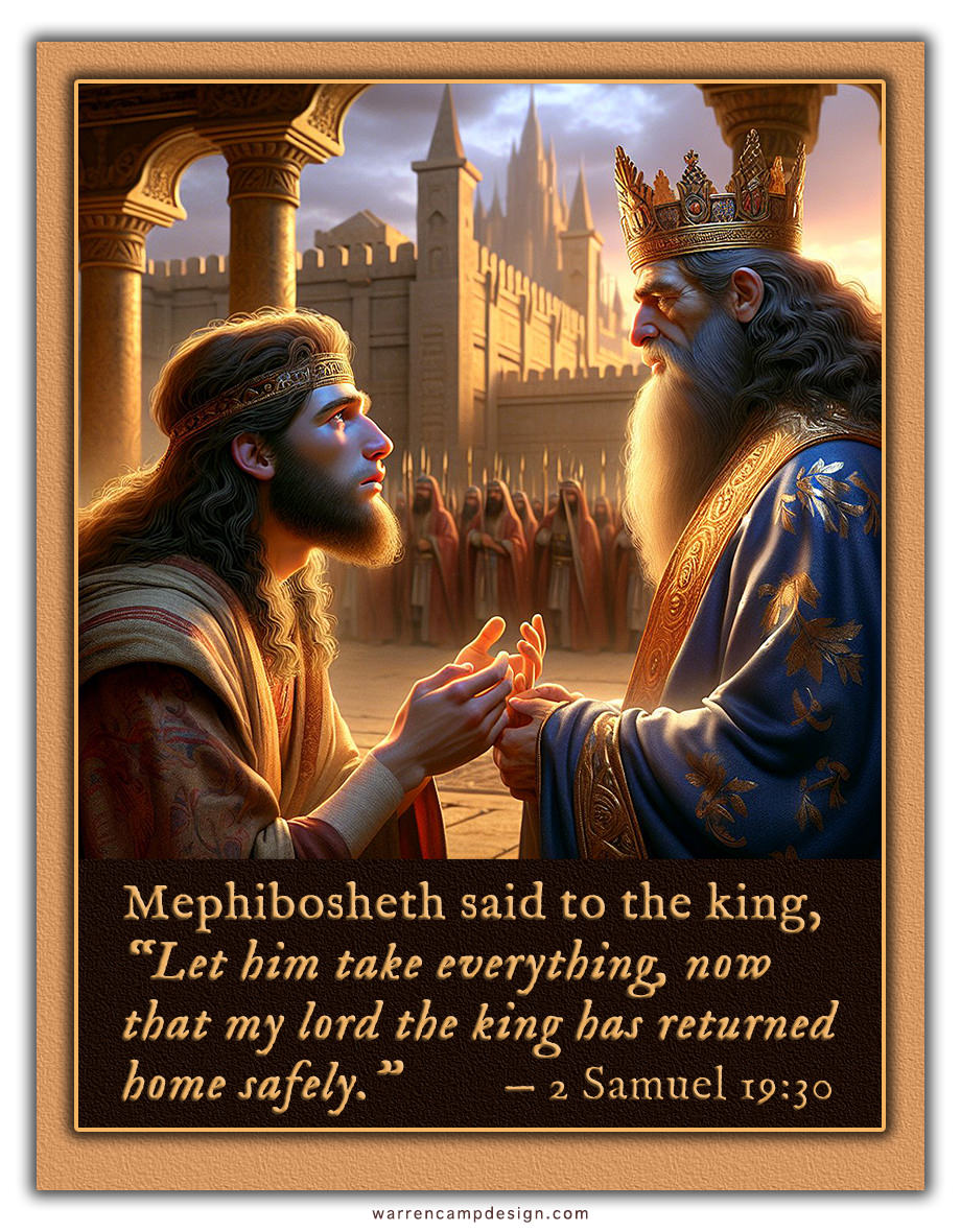 Mephibosheth said to the king, “Let him take everything, now that my lord the king has returned home safely” (2 Sam. 19:30)