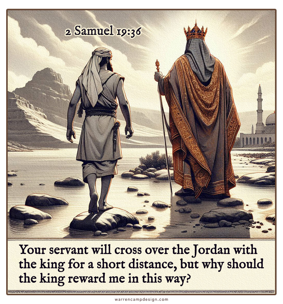 Note: We must highlight the impressive dedication of Barzillai. It was 20 to 25 miles back to the Jordan River where David was to cross it before they parted ways. David invited Barzillai to come with him to Jerusalem to be cared for in the capital (v. 33), but he politely refused, citing his advanced age of eighty years and the physical decline that prevented him from enjoying the court life in Jerusalem. Old-man Barzillai then said good-bye to his king.