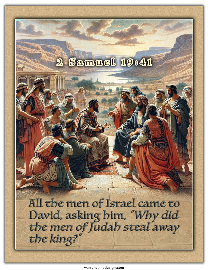 As David reaches Gilgal, a tense dispute erupts between the men of Judah and those of Israel regarding who has the greater claim and privilege in bringing the king back across the Jordan (vv. 41–43). The men of Israel feel slighted, arguing that they’re the majority and should have been included, while Judah asserts their closeness to David, their kinsman. The argument ends with harsh words, reflecting lingering divisions and jealousy between the tribes, foreshadowing future fractures in the kingdom.