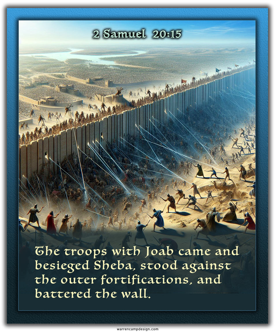 Chapter 20 introduces us to a trouble-making man named Sheba. Appearing only in this chapter, he’ll actively revolt against King David who’ll order military strong-arm, Abishai, to pursue Sheba. Joab will join the expedition, thereafter treacherously putting Amasa, an army commander, to death. Joab will lay siege to Abel Beth Maakah (meaning “Meadow of the House of Oppression”); its townspeople will cut off Sheba’s head and throw it from a wall, down toward Joab’s feet.