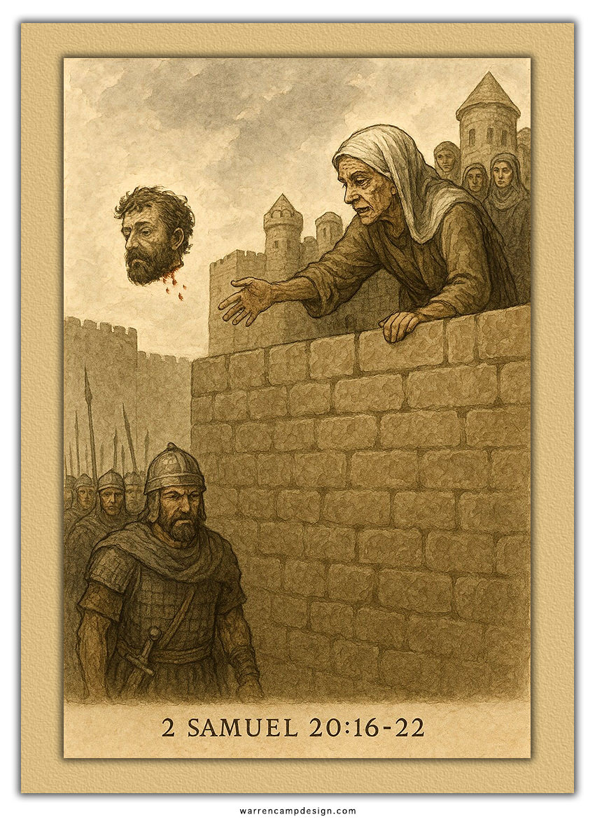 • A wise woman of Abel Beth Maacah negotiates with Joab to save her city by handing over Sheba, who gets executed by the townspeople (vv. 16–22).