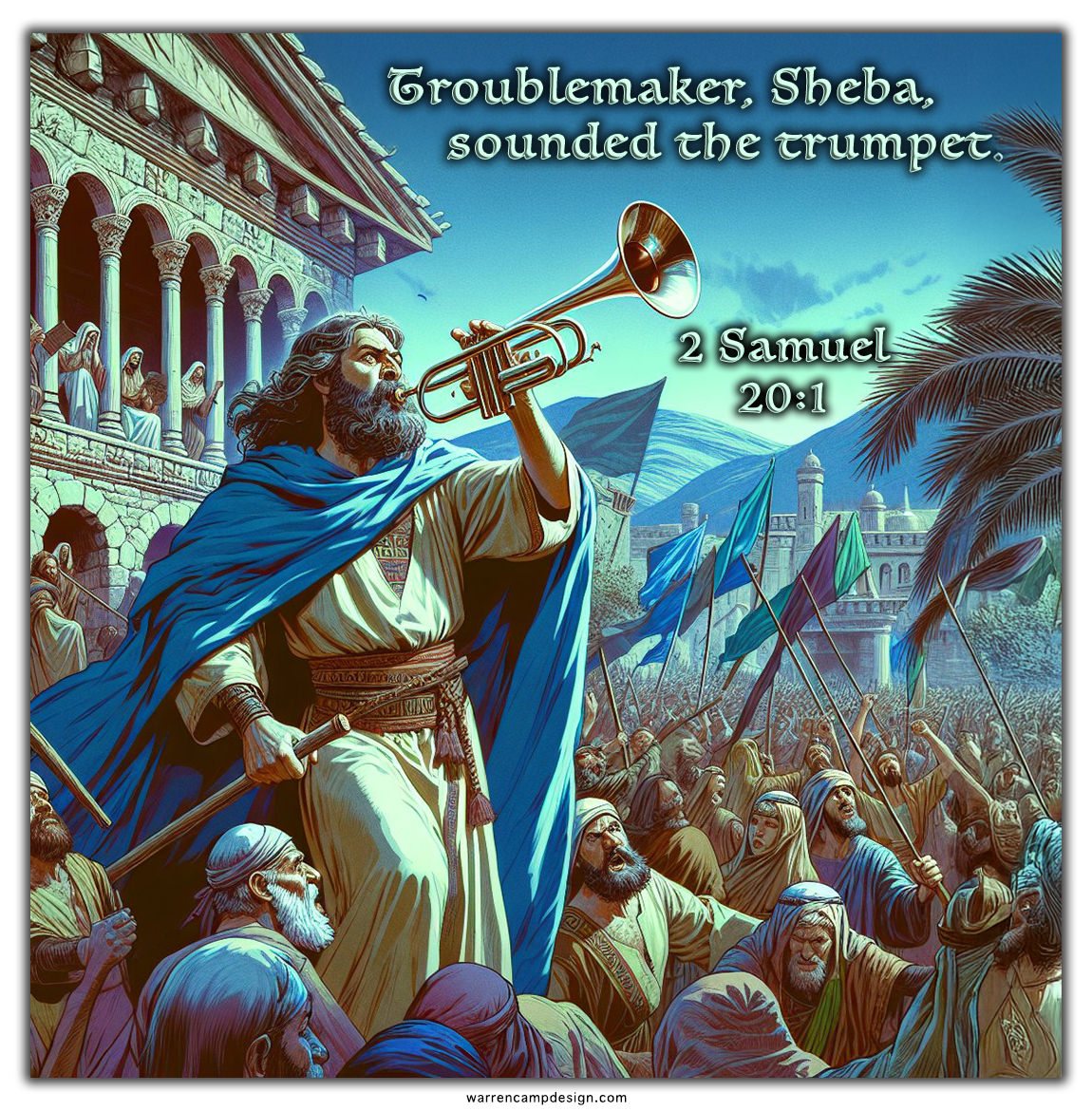 This quarrel was interrupted by Sheba, a Benjamite. Depending on the Bible version, the author informs us that Sheba was a “worthless fellow,” “troublemaker,” “scoundrel.” (The text literally reads “son of belial,” characterized as wicked or worthless.) In effect, Sheba was a “no-goodnik.” But in the heat of this argument he lost his temper (or saw an opportunity to assume leadership there) and blurted out the following: