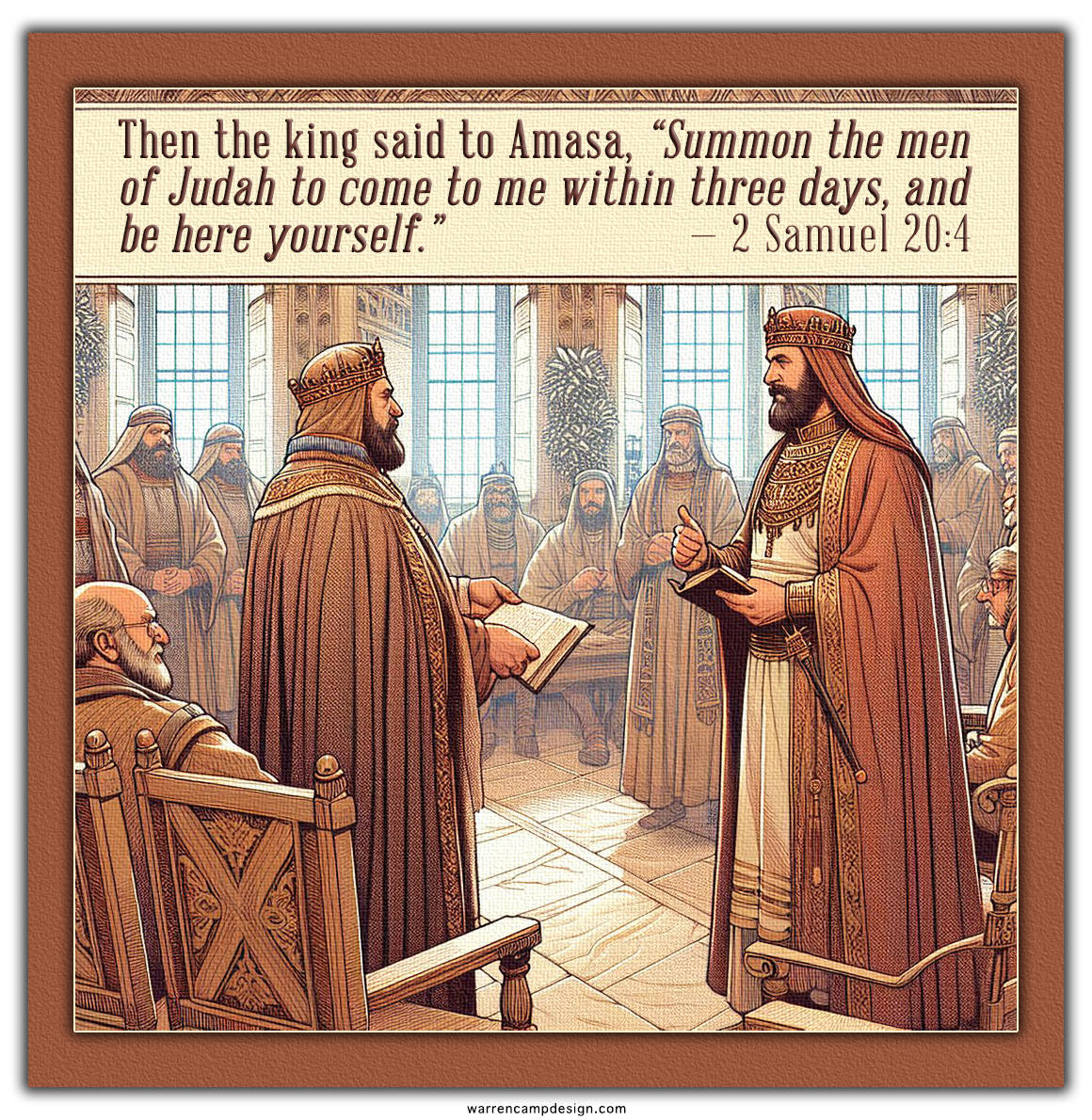 David’s escort by the northern tribes of Israel evaporated; he had no choice but to return to Jerusalem, escorted only by his own Judaean tribe. As you can imagine, unity of his kingdom was now in serious doubt. In vv. 4–5, David told Amasa to marshal an army to deal with Sheba’s rebellion. Amasa was Absalom’s former general. David made him the commander of his army as a conciliatory move, after Absalom died.