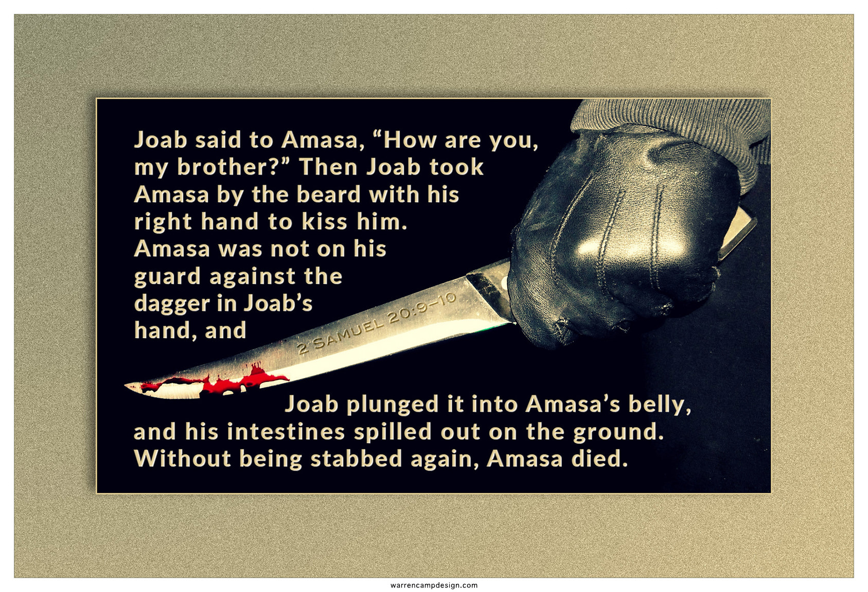Amasa apparently didn’t notice the knife that Joab held in his hand as they drew near one another. Perhaps Joab sized up the situation and realized how easy it would be for him to kill Amasa. And so he did that, approaching Amasa with cunning and deception.