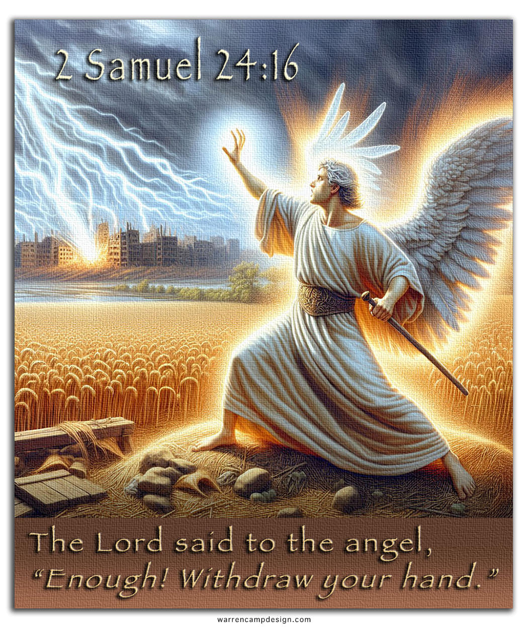 15So the Lord sent a plague on Israel from that morning until the end of the time designated, and seventy thousand of the people from Dan to Beersheba died. 16When the angel stretched out his hand to destroy Jerusalem, the Lord relented concerning the disaster and said to the angel who was afflicting the people, “Enough! Withdraw your hand.” The angel of the Lord was then at the threshing floor of Araunah the Jebusite.