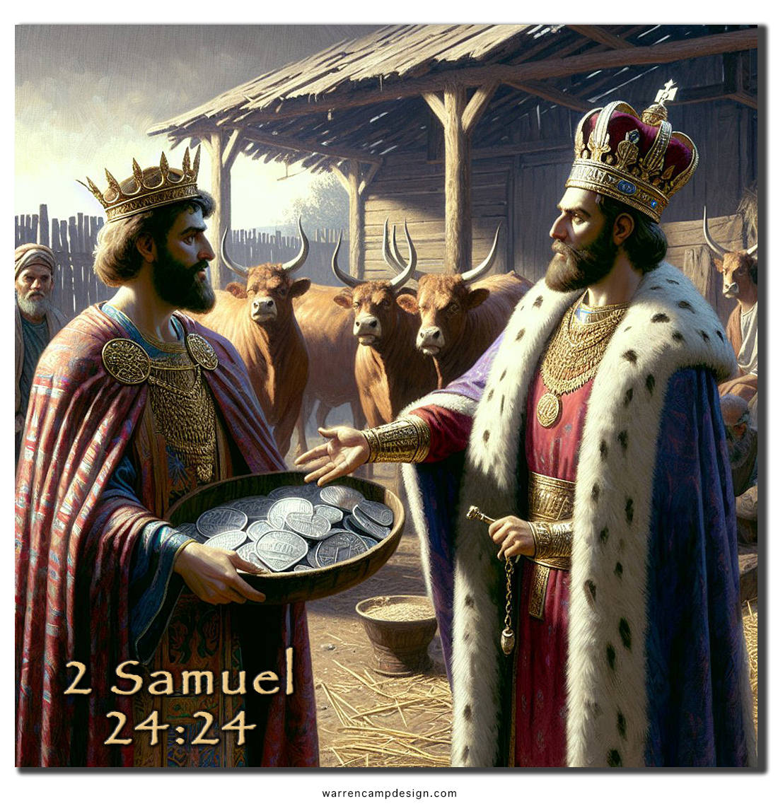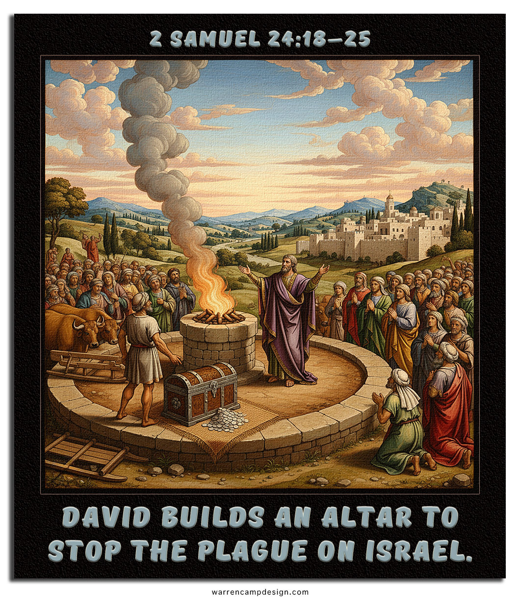 Gad the prophet then instructs David to build an altar on Araunah’s threshing floor. Araunah offers the site and offerings for free, but David insists on paying, declaring, “I will not offer burnt offerings to the LORD my God that cost me nothing.” David purchases the site, constructs an altar, and offers sacrifices. God accepts the offerings and halts the plague, restoring peace to the land.